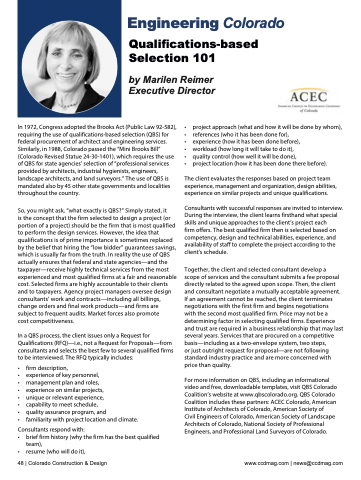 For more information on QBS, including an informational video and free, downloadable templates, visit QBS Colorado Coalition’s website at www.qbscolorado.org. QBS Colorado Coalition includes these partners: ACEC Colorado, American Institute of Architects of Colorado, American Society of