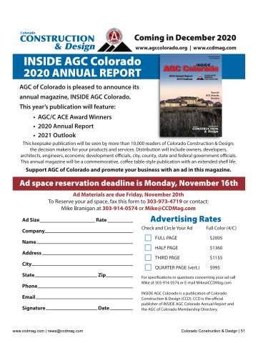 AGC Colorado INSIDE 2018 AGC Colorado Annual Magazine Special ACE Awards Section A Publication of 2018 Annual Report 2019 Outlook www.ccdmag.com | news@ccdmag.com Colorado Construction & Design | 51