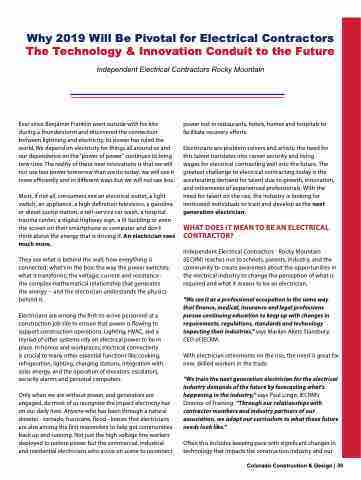 Why 2019 Will Be Pivotal for Electrical Contractors The Technology & Innovation Conduit to the Future Independent Electrical Contractors Rocky Mountain Ever since Benjamin Franklin went outside with his kite during a thunderstorm and discovered the connection between lightning and electricity, its power has ruled the world. We depend on electricity for things all around us and our dependence on the “power of power” continues to bring new uses. The reality of these new innovations is that we will not use less power tomorrow than we do today; we will use it more efficiently and in different ways but we will not use less. Most, if not all, consumers see an electrical outlet, a light switch, an appliance, a high definition television, a gasoline or diesel pump station, a self-service car wash, a hospital trauma center, a digital highway sign, a lit building or even the screen on their smartphone or computer and don’t think about the energy that is driving it. An electrician sees much more. They see what is behind the wall; how everything is connected; what’s in the box; the way the power switches; what it transforms; the voltage, current and resistance - the complex mathematical relationship that generates the energy -- and the electrician understands the physics behind it. Electricians are among the first-to-arrive personnel at a construction job site to ensure that power is flowing to support construction operations. Lighting, HVAC, and a myriad of other systems rely on electrical power to be in place. In homes and workplaces, electrical connectivity is crucial to many other essential functions like cooking, refrigeration, lighting, charging stations, integration with solar energy, and the operation of elevators, escalators, security alarms and personal computers. Only when we are without power, and generators are engaged, do most of us recognize the impact electricity has on our daily lives. Anyone who has been through a natural disaster - tornado, hurricane, flood - knows that electricians are also among the first responders to help get communities back up and running. Not just the high voltage line workers deployed to restore power but the commercial, industrial and residential electricians who arrive on scene to reconnect power lost in restaurants, hotels, homes and hospitals to facilitate recovery efforts. Electricians are problem solvers and artists; the need for this talent translates into career security and living wages for electrical contracting well into the future. The greatest challenge to electrical contracting today is the accelerating demand for talent due to growth, innovation, and retirements of experienced professionals. With the need for talent on the rise, the industry is looking for motivated individuals to train and develop as the next generation electrician. WHAT DOES IT MEAN TO BE AN ELECTRICAL CONTRACTOR? Independent Electrical Contractors - Rocky Mountain (IECRM) reaches out to schools, parents, industry, and the community to create awareness about the opportunities in the electrical industry to change the perception of what is required and what it means to be an electrician. “We see it as a professional occupation in the same way that finance, medical, insurance and legal professions pursue continuing education to keep up with changes in requirements, regulations, standards and technology impacting their industries,” says Marilyn Akers Stansbury, CEO of IECRM. With electrician retirements on the rise, the need is great for new, skilled workers in the trade. “We train the next generation electrician for the electrical industry demands of the future by forecasting what’s happening in the industry,” says Paul Lingo, IECRM’s Director of Training. “Through our relationships with contractor members and industry partners of our association, we adapt our curriculum to what those future needs look like.” Often this includes keeping pace with significant changes in technology that impacts the construction industry and our Colorado Construction & Design | 39