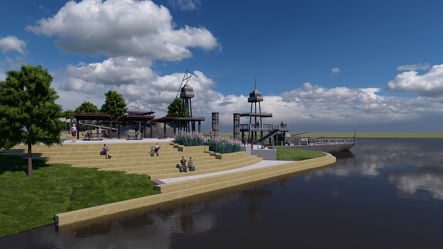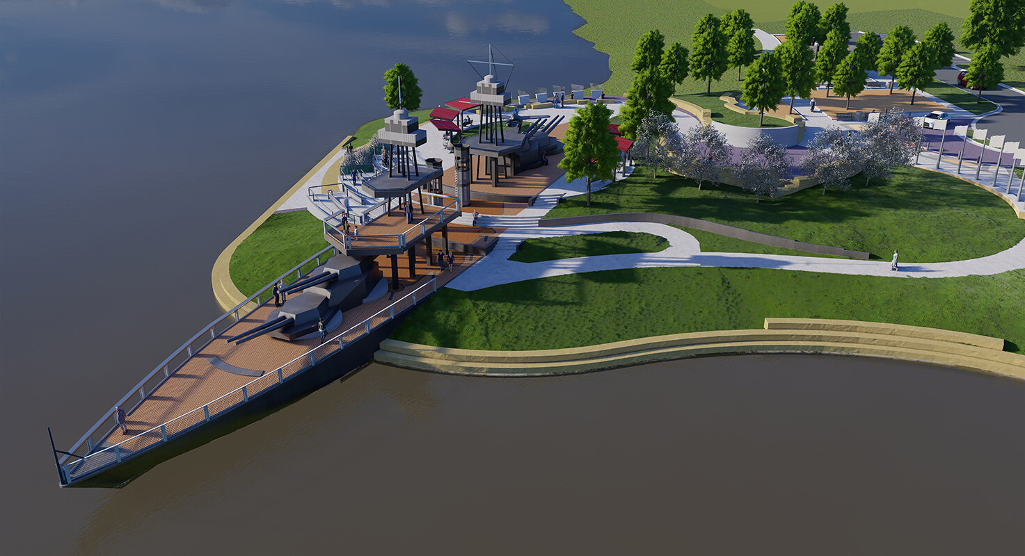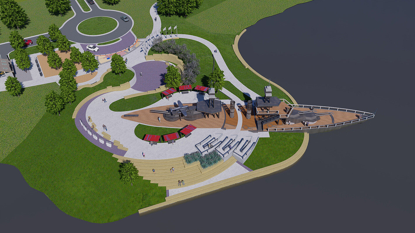 The Veterans Memorial will feature numerous unique elements, most fascinating of which being a replica of the USS Colorado battleship, which will extend into the park’s lake.