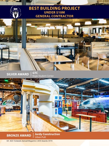 BEST BUILDING PROJECT UNDER $10M GENERAL CONTRACTOR GTC SILVER AWARD | Regis Student Center BRONZE AWARD | Urban Putt Jordy Construction 64 AGC Colorado Annual Magazine | ACE Awards 2019