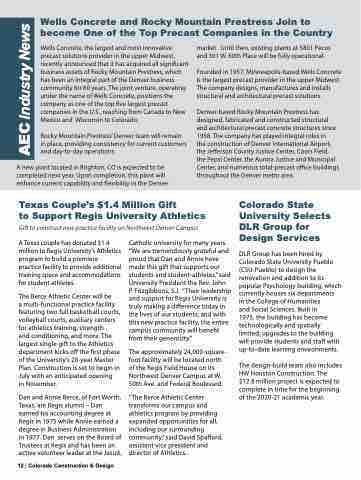 Wells Concrete and Rocky Mountain Prestress Join to become One of the Top Precast Companies in the Country Wells Concrete, the largest and most innovative precast solutions provider in the upper Midwest, recently announced that it has acquired all significant business assets of Rocky Mountain Prestress, which has been an integral part of the Denver business community for 60 years. The joint venture, operating under the name of Wells Concrete, positions the company as one of the top five largest precast companies in the U.S., reaching from Canada to New Mexico and Wisconsin to Colorado. Rocky Mountain Prestress’ Denver team will remain in place, providing consistency for current customers and day-to-day operations. A new plant located in Brighton, CO is expected to be completed next year. Upon completion, this plant will enhance current capability and flexibility in the Denver market. Until then, existing plants at 5801 Pecos and 301 W. 60th Place will be fully operational. Founded in 1957, Minneapolis-based Wells Concrete is the largest precast provider in the upper Midwest. The company designs, manufactures and installs structural and architectural precast solutions. Denver-based Rocky Mountain Prestress has designed, fabricated and constructed structural and architectural precast concrete structures since 1958. The company has played integral roles in the construction of Denver International Airport, the Jefferson County Justice Center, Coors Field, the Pepsi Center, the Aurora Justice and Municipal Center, and numerous total-precast office buildings throughout the Denver metro area. Texas Couple’s $1.4 Million Gift to Support Regis University Athletics Gift to construct new practice facility on Northwest Denver Campus Colorado State University Selects DLR Group for Design Services DLR Group has been hired by Colorado State University Pueblo (CSU-Pueblo) to design the renovation and addition to its popular Psychology building, which currently houses six departments in the College of Humanities and Social Sciences. Built in 1975, the building has become technologically and spatially limited; upgrades to the building will provide students and staff with up-to-date learning environments. The design-build team also includes HW Houston Construction. The $12.8 million project is expected to complete in time for the beginning of the 2020-21 academic year. A Texas couple has donated $1.4 million to Regis University’s Athletics program to build a premiere practice facility to provide additional training space and accommodations for student athletes. The Berce Athletic Center will be a multi-functional practice facility featuring two full basketball courts, volleyball courts, auxiliary centers for athletics training, strength and conditioning, and more. The largest single gift to the Athletics department kicks off the first phase of the University’s 20-year Master Plan. Construction is set to begin in July with an anticipated opening in November. Dan and Annie Berce, of Fort Worth, Texas, are Regis alumni – Dan earned his accounting degree at Regis in 1975 while Annie earned a degree in Business Administration in 1977. Dan serves on the Board of Trustees at Regis and has been an active volunteer leader at the Jesuit, Catholic university for many years. “We are tremendously grateful and proud that Dan and Annie have made this gift that supports our students and student-athletes,” said University President the Rev. John P. Fitzgibbons, S.J. “Their leadership and support for Regis University is truly making a difference today in the lives of our students, and with this new practice facility, the entire campus community will benefit from their generosity.” The approximately 24,000-square- foot facility will be located north of the Regis Field House on its Northwest Denver Campus at W. 50th Ave. and Federal Boulevard. “The Berce Athletic Center transforms our campus and athletics program by providing expanded opportunities for all, including our surrounding community,” said David Spafford, assistant vice president and director of Athletics. 12 | Colorado Construction & Design AEC Industry News