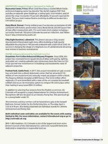 INNOVATION Category (category sponsored by Redland) Basecamp Center, Frisco. What could have been a routine Whole Foods- anchored shopping center has become “the world’s highest TOD” that includes six separate green buildings, a central park, local retailers, and 24 above-the-shop microunits (75 percent affordable, 50 percent reserved for locals). The jury cited creative finance involving six different lenders for a $30 million project. Dairy Block, Denver. A long-stalled project has become an exemplar of infill combined with historic preservation. Dairy Block blends 250,000 square feet of new office construction with 172-room hotel, local retailers including a successful food hall, 700-piece Colorado-focused art collection, and “Maker Space” alley enlivened by public art. Fifty Eight Hundred, Lakewood. This project rescues a long vacant/ abandoned/contaminated eight-story office building as high-quality affordable housing that is 100 percent preleased with a wait-list of 3,500. Its success is changing the image of a blighted area of Lakewood and attracting new interest in business revitalization. INSPIRE (category sponsored by Trammell Crow Co.) Downtown Fort Collins Enhanced Alleyway Program. Since 2006, this project has revamped seven square blocks of alleys with paving, lighting and public art, creating walkable new connections from Old Town to CSU. It has spurred new investment in 12 buildings and boosted the value of adjacent properties. Festival Park, Castle Rock. In 2017, this project remodeled an ugly, unused two-acre park into a vibrant downtown center that has attracted $150 million of new investment into vertically mixed-use projects within a block. The Regency Athletic Complex at MSU Denver. This $23.6 million effort replaced a 12-acre brownfield with a state-of-the-art complex for baseball, softball and soccer. An innovative system to compact fill soil in place rather than hauling it away saved MSU $3 million. In addition to selecting four projects from the finalists as winners, ULI Colorado will recognize a Legacy Award winner for Lifetime Achievement. Recognition will also be given to an industry Rising Star. This award will go to a young leader under 35. The nominees and four winners will be honored at a gala at the Seawell Ballroom, Denver Center for the Performing Arts, on Thursday, April 4, 5:30 to 8:30 pm. Also being presented are individual awards for Lifetime Achievement and Rising Star. Both individual seats and tables are available for the event, with seating limited to 500. For more information, contact Colorado@uli.org or go to http://colorado.uli.org. With 1,400 members, ULI Colorado is one of the largest and most active District Councils of the international ULI, a 501(c)(3) nonprofit think tank dedicated to leadership in responsible land use. Colorado Construction & Design | 13 Basecamp Center Dairy Block Fifty Eight Hundred Fort Collins Enhanced Alleyway Program Festival Park