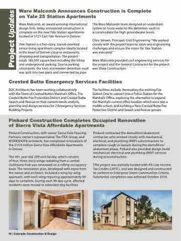 Ware Malcomb Announces Construction is Complete on Yale 25 Station Apartments Ware Malcomb, an award-winning international design firm, today announced construction is complete on the new Yale Station apartments located at 5121 East Yale Avenue in Denver. Yale Station is a five-story, transit-oriented senior living apartment complex ideally located in the heart of Denver close to restaurants, shopping and transportation. The project totals 186,500 square feet including the lobby and underground parking. Due to parking constraints, the site’s stormwater detention vault was split into two parts and connected by pipe. The Ware Malcomb team designed an underdrain system to route water to the detention vault to accommodate the high groundwater levels. Chris Strawn, Principal, Civil Engineering. “We worked closely with the project team to solve any engineering challenges and ensure the vision for Yale Station was executed.” Ware Malcomb provided civil engineering services for the project and the General Contractor for the project was Shaw Construction. Crested Butte Emergency Services Facilities D2C Architects has been working collaboratively with the Town of Crested Butte’s Marshal’s Office, The Crested Butte Fire Protection District and Crested Butte Search and Rescue on their current needs analysis, planning and design services for 2 Emergency Services Building Projects. The facilities include: Renovating the existing Fire Station One to convert into a Police Station for the Marshal’s Office, exploring the alternative to expand the Marshal’s current office location which once was a middle school, and building a New Crested Butte Fire Protective District and Search and Rescue groups. Pinkard Construction Completes Occupied Renovation of Sierra Vista Affordable Apartments Pinkard Construction, with owner Sierra Vista Housing Partners, owner’s representative The ITEX Group, and WORKSHOP8 architects, has completed renovations of the $10.9 million Sierra Vista Affordable Apartments in Denver. The 40+ year old, 209-unit facility, which consists of four, three-story wings radiating from a central clubhouse-hub was renovated on a rolling-occupancy basis. The renovation plan, developed with input from the owner and architect, included a wing-by-wing approach, with each wing requiring approximately 90 days to complete. During each 90-day cycle, affected residents were moved to extended stay facilities. Pinkard contracted the demolition/abatement contractor, who worked closely with mechanical, electrical, and plumbing (MEP) subcontractors to complete rough-in layouts during the demolition/ abatement phase. Pinkard also provided design-build mechanical, electrical and plumbing (MEP) services during preconstruction. \]The project was partially funded with 4% Low Income Tax Credits (LIHTC), and was designed and constructed to conform to Enterprise Green Communities Criteria. Substantial completion was achieved October 2018. 16 | Colorado Construction & Design Project Updates
