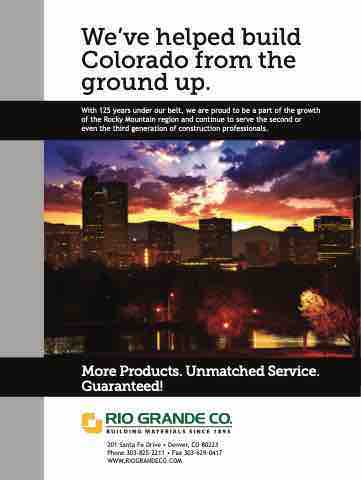We’ve helped build Colorado from the ground up. With 125 years under our belt, we are proud to be a part of the growth of the Rocky Mountain region and continue to serve the second or even the third generation of construction professionals. More Products. Unmatched Service. Guaranteed! 201 Santa Fe Drive • Denver, CO 80223 Phone 303-825-2211 • Fax 303-629-0417 WWW.RIOGRANDECO.COM