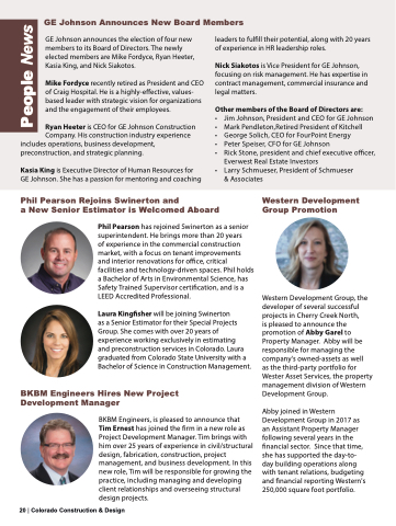 GE Johnson Announces New Board Members GE Johnson announces the election of four new members to its Board of Directors. The newly elected members are Mike Fordyce, Ryan Heeter, Kasia King, and Nick Siakotos. Mike Fordyce recently retired as President and CEO of Craig Hospital. He is a highly-effective, values- based leader with strategic vision for organizations and the engagement of their employees. Ryan Heeter is CEO for GE Johnson Construction Company. His construction industry experience includes operations, business development, preconstruction, and strategic planning. Kasia King is Executive Director of Human Resources for GE Johnson. She has a passion for mentoring and coaching leaders to fulfill their potential, along with 20 years of experience in HR leadership roles. Nick Siakotos is Vice President for GE Johnson, focusing on risk management. He has expertise in contract management, commercial insurance and legal matters. Other members of the Board of Directors are: • Jim Johnson, President and CEO for GE Johnson • Mark Pendleton,Retired President of Kitchell • George Solich, CEO for FourPoint Energy • Peter Speiser, CFO for GE Johnson • Rick Stone, president and chief executive officer, Everwest Real Estate Investors • Larry Schmueser, President of Schmueser & Associates Phil Pearson Rejoins Swinerton and a New Senior Estimator is Welcomed Aboard Phil Pearson has rejoined Swinerton as a senior superintendent. He brings more than 20 years of experience in the commercial construction market, with a focus on tenant improvements and interior renovations for office, critical facilities and technology-driven spaces. Phil holds a Bachelor of Arts in Environmental Science, has Safety Trained Supervisor certification, and is a LEED Accredited Professional. Laura Kingfisher will be joining Swinerton as a Senior Estimator for their Special Projects Group. She comes with over 20 years of experience working exclusively in estimating and preconstruction services in Colorado. Laura graduated from Colorado State University with a Bachelor of Science in Construction Management. BKBM Engineers Hires New Project Development Manager BKBM Engineers, is pleased to announce that Tim Ernest has joined the firm in a new role as Project Development Manager. Tim brings with him over 25 years of experience in civil/structural design, fabrication, construction, project management, and business development. In this new role, Tim will be responsible for growing the practice, including managing and developing client relationships and overseeing structural design projects. Western Development Group Promotion Western Development Group, the developer of several successful projects in Cherry Creek North, is pleased to announce the promotion of Abby Garel to Property Manager. Abby will be responsible for managing the company's owned-assets as well as the third-party portfolio for Wester Asset Services, the property management division of Western Development Group. Abby joined in Western Development Group in 2017 as an Assistant Property Manager following several years in the financial sector. Since that time, she has supported the day-to- day building operations along with tenant relations, budgeting and financial reporting Western's 250,000 square foot portfolio. 20 | Colorado Construction & Design People News