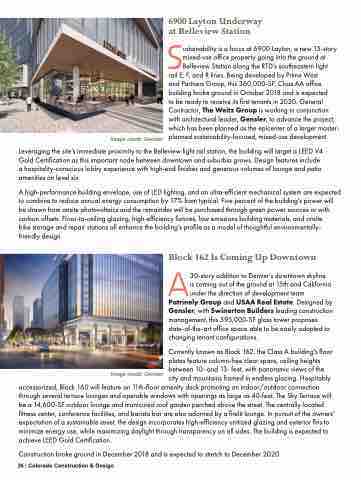 Image credit: Gensler 6900 Layton Underway at Belleview Station Sustainability is a focus at 6900 Layton, a new 15-story mixed-use office property going into the ground at Belleview Station along the RTD’s southeastern light rail E, F, and R lines. Being developed by Prime West and Partners Group, this 360,000-SF, Class AA office building broke ground in October 2018 and is expected to be ready to receive its first tenants in 2020. General Contractor, The Weitz Group is working in conjunction with architectural leader, Gensler, to advance the project, which has been planned as the epicenter of a larger master- planned sustainability-focused, mixed-use development. Leveraging the site’s immediate proximity to the Belleview light rail station, the building will target a LEED V4 Gold Certification as this important node between downtown and suburbia grows. Design features include a hospitality-conscious lobby experience with high-end finishes and generous volumes of lounge and patio amenities on level six. A high-performance building envelope, use of LED lighting, and an ultra-efficient mechanical system are expected to combine to reduce annual energy consumption by 17% from typical. Five percent of the building’s power will be drawn from onsite photovoltaics and the remainder will be purchased through green power sources or with carbon offsets. Floor-to-ceiling glazing, high-efficiency fixtures, low emissions building materials, and onsite bike storage and repair stations all enhance the building’s profile as a model of thoughtful environmentally- friendly design. Image credit: Gensler Block 162 Is Coming Up Downtown A30-story addition to Denver’s downtown skyline is coming out of the ground at 15th and California under the direction of development team Patrinely Group and USAA Real Estate. Designed by Gensler, with Swinerton Builders leading construction management, this 595,000-SF glass tower proposes state-of-the-art office space able to be easily adapted to changing tenant configurations. Currently known as Block 162, the Class A building’s floor plates feature column-free clear spans, ceiling heights between 10- and 13- feet, with panoramic views of the city and mountains framed in endless glazing. Hospitably accessorized, Block 160 will feature an 11th-floor amenity deck promoting an indoor/outdoor connection through several terrace lounges and operable windows with openings as large as 40-feet. The Sky Terrace will be a 14,600-SF outdoor lounge and manicured roof garden perched above the street. The centrally located fitness center, conference facilities, and barista bar are also adorned by a firelit lounge. In pursuit of the owners’ expectation of a sustainable asset, the design incorporates high-efficiency unitized glazing and exterior fins to minimize energy use, while maximizing daylight through transparency on all sides. The building is expected to achieve LEED Gold Certification. Construction broke ground in December 2018 and is expected to stretch to December 2020. 26 | Colorado Construction & Design