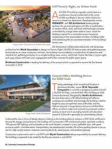 Image credit: OZ Architecture & Wenk Associates LOT Twenty-Eight, an Urban Oasis A45,000-SF building originally constructed as a warehouse is being transformed at the corner of 28th and Blake in Denver’s RiNo District for reuse as a mixed-use destination. Developed by owner, FORMATIV, with OZ Architecture leading design services, the recomposed space will offer a combination of creative office, retail, and food and beverage concepts surrounded by a large urban exterior oasis. Inside the treatment aspires for a minimalist revision based on modernizing to the requirements of today’s building codes and maintaining the accumulated character of the building’s former uses. OZ Architecture collaborated extensively with landscape architecture firm Wenk Associates to design Lot Twenty-Eight’s 20,000-SF exterior patio and gathering areas. Envisioned as an urban community activator, the building is surrounded by a combination of interactive and industrial art, gathering and play to co-mingle building users, visitors, and locals. Events like bike-in movie nights and yoga classes will foster civic engagement and further animate the public green space. Brinkman Construction is leading the delivery of the project which is expected to receive the first tenants and public in 2019. Image credit: Studio Architecture Canyon Office Building Strives for LEED Gold Taking advantage of an exceptional location in downtown Boulder, owner W.W. Reynolds Companies is currently in progress on plans to build a 24,500-SF Class, core and shell office building at 1650 Canyon Boulevard. Designed by Studio Architecture, the new three-story in-fill office building will reflect a contemporary aesthetic and leverage the building’s relative height to enjoy exceptional views of Boulder and the Flatirons beyond. A large terrace will surround third-floor offices on all four sides and is joined by protected outdoor seating on level one in providing tenants with abundant access to Colorado’s generally accommodating climate. Sustainability was a focus of design decision making as the building plans to achieve a LEED Gold certification. Among the energy-saving features, the building will incorporate a VRF mechanical system, operable windows, 100 percent LED lighting, and sunshades on the south façade. Located in a very walkable area, with great access to public- and alternative- transportation, the development includes 38 surface parking spaces in an on- site lot. High quality exterior materials used include brick, metal panels, and storefront glazing. Construction is planned to start in mid-2019 with Wyatt Construction taking responsibility for project delivery. The building is expected to be ready for the first new tenants in mid-2020. 28 | Colorado Construction & Design