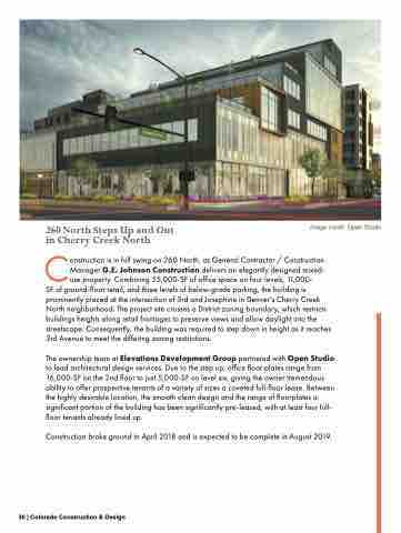 260 North Steps Up and Out in Cherry Creek North Image credit: Open Studio Construction is in full swing on 260 North, as General Contractor / Construction Manager G.E. Johnson Construction delivers an elegantly designed mixed- use property. Combining 55,000-SF of office space on four levels, 11,000- SF of ground-floor retail, and three levels of below-grade parking, the building is prominently placed at the intersection of 3rd and Josephine in Denver’s Cherry Creek North neighborhood. The project site crosses a District zoning boundary, which restricts buildings heights along retail frontages to preserve views and allow daylight into the streetscape. Consequently, the building was required to step down in height as it reaches 3rd Avenue to meet the differing zoning restrictions. The ownership team at Elevations Development Group partnered with Open Studio to lead architectural design services. Due to the step up, office floor plates range from 16,000-SF on the 2nd floor to just 5,000-SF on level six, giving the owner tremendous ability to offer prospective tenants of a variety of sizes a coveted full-floor lease. Between the highly desirable location, the smooth clean design and the range of floorplates a significant portion of the building has been significantly pre-leased, with at least four full- floor tenants already lined up. Construction broke ground in April 2018 and is expected to be complete in August 2019. 30 | Colorado Construction & Design