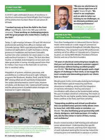 E LIGHT ELECTRIC – Excellence in Electrical In 2018 E Light celebrated 20 years of excellence in electrical contracting and David Wright, Vice President of Preconstruction has been there for just about all of them. “I worked my way up from the field to the front office,” says Wright, now in his 18th year with the company. “I love working on challenging projects with the great people who make them a reality in the field.” Today, E Light employs between 250 and 300 electrical professionals working from offices in Denver and Colorado Springs. With a specialized portfolio of large commercial applications, E Light maintains a strong presence in healthcare and has been Colorado’s number one solar contractor for seven years in a row with electrical licenses in 11 states. The firm also does routine, as-needed, and emergency service work and takes great pride in having recently passed more than 6.5 million-man hours in the field with no lost time due to excellent safety. Integration of systems, solutions, processes, and possibilities is a continual focus at E Light. Software programs like Bluebeam, iAuditor, Revit, and AUTOCAD MEP among others are all seamlessly incorporated into project development to control costs, improve schedules, and decrease risks. Continual staff training and the advancement of prefabrication strategies are essential to E Light’s objectives. Among the many interesting projects E Light worked on in 2018, Pilatus is a 114,000-SF hanger at the Rocky Mountain Metropolitan Airport in Broomfield that functions as a U.S.-based finishing station for a Swedish custom private aircraft maker. “We pay our electricians to take classes right here at E Light,” shares Wright. “We invest in our employees and are able to tailor our training to our challenges, so we eliminate problems and increase performance.” David Wright, Vice President of Preconstruction - E Light Electric From their headquarters in Lakewood, Encore Electric meets client needs on a wide range of commercial construction projects throughout Colorado, Wyoming, and Montana. The company’s nearly 900 professionals working out of six offices in Colorado and a Cheyenne location, are led by Willis Wiedel, President of Encore Electric and one of the firm’s founders. “42 years in electrical contracting have taught me that you can’t provide excellent customer support and services without having excellent people,” says Wiedel. “We find top-notch people want a high degree of challenge in their work, so we target the most complex and demanding projects our clients have as a focus.” Wiedel points to the continually evolving technologies like Total Station optical measuring and three- dimensional modeling, along with the integration of real-time information sharing and project coordination with others as the fundamentals setting the pace in today’s electrical contracting. The results at Encore Electric are higher quality, better management, fewer conflicts in the field, and more certainty. “Integrating modeling and virtual coordination into our prefabrication process really allows crews to move fast, with little waste or mistakes, says Wiedel. “It’s also facilitating great partnership with clients, designers, and trade partners. It’s really a win, win for the owner in terms of time, money, and confidence.” Encore invests heavily in staff training and individual career advancement. Understanding the specific abilities, career interests, and long-term objectives of each individual working for Encore has helped the company grow and individuals to advance in unison. ENCORE ELECTRIC – All Things Power, Technology and Energy 34 | Colorado Construction & Design