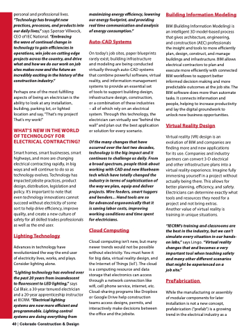 personal and professional lives. “Technology has brought new practices, processes, and products into our daily lives,” says Spenser Villwock, CEO of IEC National. “Embracing the wave of continual change in technology to gain efficiencies in operations, win jobs on cutting edge projects across the country, and drive what and how we do our work on job sites makes now and the future an incredibly exciting in the history of the construction industry.” Perhaps one of the most fulfilling aspects of being an electrician is the ability to look at any installation, building, parking lot, or lighted location and say, “That’s my project! That’s my work!” WHAT’S NEW IN THE WORLD OF TECHNOLOGY FOR ELECTRICAL CONTRACTING? Smart homes, smart businesses, smart highways, and more are changing electrical contracting rapidly, in big ways and will continue to do so as technology evolves. Technology has impacted jobsite practices, product design, distribution, legislation and policy. It’s important to note that even technology innovations cannot succeed without electricity of some sort to help drive efficiency, improve quality, and create a new culture of safety for all skilled trades professionals as well as the end user. Lighting Technology Advances in technology have revolutionized the way the end user of electricity lives, works, and plays. Consider lighting alone. “Lighting technology has evolved over the past 20 years from incandescent to fluorescent to LED lighting,” says Cal Blair, a 30-year tenured electrician and a 20-year apprenticeship instructor at IECRM. “Electrical lighting systems are now more efficient and programmable. Lighting control systems are doing everything from maximizing energy efficiency, lowering our energy footprint, and providing real time communication and analysis of energy consumption.” Auto-CAD Systems On today’s job sites, paper blueprints rarely exist; building infrastructure and modeling are being conducted virtually through auto-CAD systems that combine powerful software, virtual reality, and information management systems to provide an essential set of tools to support building design, infrastructure design, construction, or a combination of these industries – all of which rely on an electrical system. Through this technology, the electrician can virtually see “behind the wall” and plan out the best application or solution for every scenario. Of the many changes that have occurred over the last two decades, technology is the big impact and it continues to challenge us daily. From a broad spectrum, people think about working with CAD and new Bluebeam tech which have totally changed the industry in terms of sophistication of the way we plan, equip and deliver projects. Wire feeders, smart tuggers and benders... Hand tools are so far advanced ergonomically that it is saving labor costs, improving working conditions and time spent for electricians. Cloud Computing Cloud computing isn’t new, but many newer trends would not be possible without electricity. You must have it for big data, virtual reality design, and the Internet of Things (IoT). The cloud is a computing resource and data storage that electronics can access through a network connection like wifi, cell phone service, internet, etc. Cloud-sharing programs like Dropbox or Google Drive help construction teams access designs, permits, and interactively make decisions between the office and the jobsite. Building Information Modeling BIM (Building Information Modeling) is an intelligent 3D model-based process that gives architecture, engineering, and construction (AEC) professionals the insight and tools to more efficiently plan, design, construct, and manage buildings and infrastructure. BIM allows electrical contractors to plan and execute more efficiently with connected BIM workflows to support better informed decision making and more predictable outcomes at the job site. The BIM software does more than automate tasks. It connects information and people, helping to increase productivity and lay the digital groundwork to unlock new business opportunities. Virtual Reality Design Virtual reality (VR) design is an evolution of BIM and companies are finding more and new applications for its use. Companies and industry partners can convert 3-D electrical and other infrastructure plans into a virtual reality experience. Imagine fully immersing yourself in a project without actually being there. This allows for better planning, efficiency, and safety. Electricians can determine exactly what tools and resources they need for a project and not bring extras. Another value of virtual reality is training in unique situations. “IECRM’s training and classrooms are the best in the industry, but we can’t simulate every situation in our hands- on labs,” says Lingo. “Virtual reality changes that and becomes a very important tool when teaching safety and many other different scenarios that might be experienced on a job site.” PreFabrication While the manufacturing or assembly of modular components for later installation is not a new concept, prefabrication (“prefab”) is a growing trend in the electrical industry as a 40 | Colorado Construction & Design