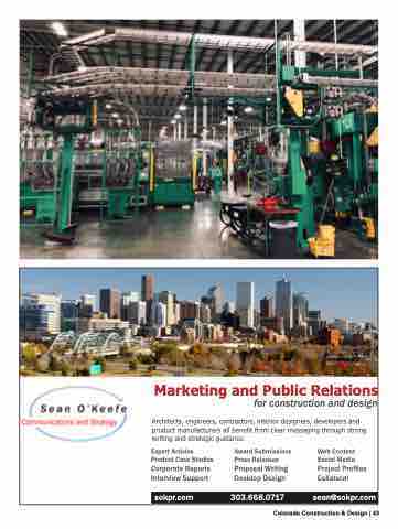 Marketing and Public Relations for construction and design Architects, engineers, contractors, interior designers, developers and product manufacturers all benefit from clear messaging through strong writing and strategic guidance. Expert Articles Product Case Studies Corporate Reports Interview Support Award Submissions Press Releases Proposal Writing Desktop Design Web Content Social Media Project Profiles Collateral sokpr.com 303.668.0717 sean@sokpr.com Colorado Construction & Design | 43