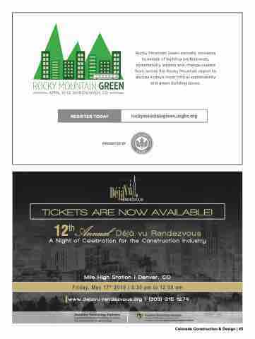 Rocky Mountain Green annually convenes hundreds of building professionals, sustainability leaders and change-makers from across the Rocky Mountain region to discuss today’s most critical sustainability and green building issues. REGISTER TODAY rockymountaingreen.usgbc.org PRESENTED BY TICKETS ARE NOW AVAILABLE! 12thAnnual Déjà vu Rendezvous A Night of Celebration for the Construction Industry Mile High Station | Denver, CO Friday, May 17th 2019 | 5:30 pm to 12:00 am www.dejavu-rendezvous.org | (303) 315-1274 Assistive Technology Partners empowering individuals with disabilities to achieve their highest potential through technology Colorado Construction & Design | 45