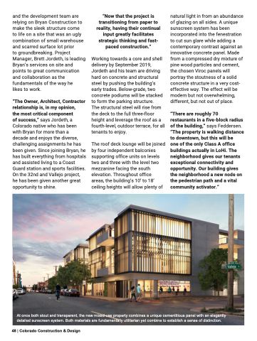 and the development team are relying on Bryan Construction to make the sleek structure come to life on a site that was an ugly combination of small warehouse and scarred surface lot prior to groundbreaking. Project Manager, Brett Jordeth, is leading Bryan’s services on site and points to great communication and collaboration as the fundamentals of the way he likes to work. “The Owner, Architect, Contractor relationship is, in my opinion, the most critical component of success,” says Jordeth, a Colorado native who has been with Bryan for more than a decade and enjoys the diverse, challenging assignments he has been given. Since joining Bryan, he has built everything from hospitals and assisted living to a Coast Guard station and sports facilities. On the 32nd and Vallejo project, he has been given another great opportunity to shine. “Now that the project is transitioning from paper to reality, having their continual input greatly facilitates strategic thinking and fast- paced construction.” Working towards a core and shell delivery by September 2019, Jordeth and his team are driving hard on concrete and structural steel by pushing the building’s early trades. Below-grade, two concrete podiums will be stacked to form the parking structure. The structural steel will rise from the deck to the full three-floor height and leverage the roof as a fourth-level, outdoor terrace, for all tenants to enjoy. The roof deck lounge will be joined by four independent balconies supporting office units on levels two and three with the level two mezzanine facing the south elevation. Throughout office areas, the building’s 10’ to 18’ ceiling heights will allow plenty of natural light in from an abundance of glazing on all sides. A unique sunscreen system has been incorporated into the fenestration to cut sun glare while adding a contemporary contrast against an innovative concrete panel. Made from a compressed dry mixture of pine wood particles and cement, the chosen Viroc panels will portray the stoutness of a solid concrete structure in a very cost- effective way. The effect will be modern but not overwhelming, different, but not out of place. “There are roughly 70 restaurants in a five-block radius of the building,” says Feddersen. “The property is walking distance to downtown, but this will be one of the only Class A office buildings actually in LoHi. The neighborhood gives our tenants exceptional connectivity and opportunity. Our building gives the neighborhood a new node on the pedestrian path and a vital community activator.” At once both stout and transparent, the new mixed-use property combines a unique cementitious panel with an elegantly detailed sunscreen system. Both materials are fundamentally utilitarian yet combine to establish a sense of distinction. 48 | Colorado Construction & Design