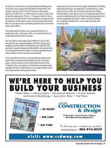So how can we continue to grow while providing parks and open space and protecting the environment? The answer may lie in the “mining” of an overabundant resource. In Denver, I’m referring to the city’s 7,338 acres of paved parking lots. That is 11.5 square miles, or more than twice the size of the entire Stapleton neighborhood at build-out. That doesn’t even count paving from roads. Much more than vertical building contributes to Denver’s heat-island effect. That total asphalt surface also exceeds all Denver’s green space by 1,100 acres. There are only 204 acres of undeveloped land left in Denver. Ok, but where will people park? With the rise of ride- sharing, the growing popularity of transit, biking and walking, and the future of driverless cars, demand for parking is already dropping. Meanwhile rising land costs encourage the transformation of surface parking lots to vertical places where people live and work. Cities like New York have seen population and density spike with commensurate growth in parks and open space, mostly achieved by reclaiming industrial land. In Denver, the new green roof ordinance may also help mitigate the heat-island effect as we replace black roofs with solar panels and prairie grasses. Like most cities, Denver faces tough challenges, including industrial pollution, gentrification, homelessness, rising violent crime, traffic, and the persistent Brown Cloud. Density does create issues such as congestion and loss of scale in neighborhoods. But these are growing pains that can be mitigated. Density in itself is not the problem but a positive symptom for a growing, thriving, and maturing city. WE’RE HERE TO HELP YOU BUILD YOUR BUSINESS People News • Industry Events • Educational Features • Project Updates Architectural Renderings • Association News • Your News • IN PRINT • ON LINE • ON TIME Colorado's Construction News And Marketing Magazine To discuss your marketing, contact: mike@ccdmag.com • 303-914-0574 visit: www.ccdmag.com Colorado Construction & Design | 51