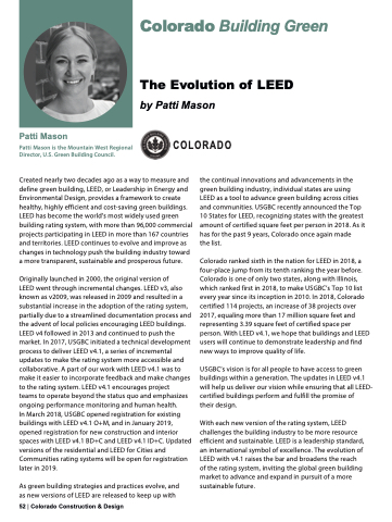 Patti Mason Patti Mason is the Mountain West Regional Director, U.S. Green Building Council. Colorado Building Green The Evolution of LEED by Patti Mason COLORADO Created nearly two decades ago as a way to measure and define green building, LEED, or Leadership in Energy and Environmental Design, provides a framework to create healthy, highly efficient and cost-saving green buildings. LEED has become the world’s most widely used green building rating system, with more than 96,000 commercial projects participating in LEED in more than 167 countries and territories. LEED continues to evolve and improve as changes in technology push the building industry toward a more transparent, sustainable and prosperous future. Originally launched in 2000, the original version of LEED went through incremental changes. LEED v3, also known as v2009, was released in 2009 and resulted in a substantial increase in the adoption of the rating system, partially due to a streamlined documentation process and the advent of local policies encouraging LEED buildings. LEED v4 followed in 2013 and continued to push the market. In 2017, USGBC initiated a technical development process to deliver LEED v4.1, a series of incremental updates to make the rating system more accessible and collaborative. A part of our work with LEED v4.1 was to make it easier to incorporate feedback and make changes to the rating system. LEED v4.1 encourages project teams to operate beyond the status quo and emphasizes ongoing performance monitoring and human health. In March 2018, USGBC opened registration for existing buildings with LEED v4.1 O+M, and in January 2019, opened registration for new construction and interior spaces with LEED v4.1 BD+C and LEED v4.1 ID+C. Updated versions of the residential and LEED for Cities and Communities rating systems will be open for registration later in 2019. As green building strategies and practices evolve, and as new versions of LEED are released to keep up with 52 | Colorado Construction & Design the continual innovations and advancements in the green building industry, individual states are using LEED as a tool to advance green building across cities and communities. USGBC recently announced the Top 10 States for LEED, recognizing states with the greatest amount of certified square feet per person in 2018. As it has for the past 9 years, Colorado once again made the list. Colorado ranked sixth in the nation for LEED in 2018, a four-place jump from its tenth ranking the year before. Colorado is one of only two states, along with Illinois, which ranked first in 2018, to make USGBC’s Top 10 list every year since its inception in 2010. In 2018, Colorado certified 114 projects, an increase of 38 projects over 2017, equaling more than 17 million square feet and representing 3.39 square feet of certified space per person. With LEED v4.1, we hope that buildings and LEED users will continue to demonstrate leadership and find new ways to improve quality of life. USGBC’s vision is for all people to have access to green buildings within a generation. The updates in LEED v4.1 will help us deliver our vision while ensuring that all LEED- certified buildings perform and fulfill the promise of their design. With each new version of the rating system, LEED challenges the building industry to be more resource efficient and sustainable. LEED is a leadership standard, an international symbol of excellence. The evolution of LEED with v4.1 raises the bar and broadens the reach of the rating system, inviting the global green building market to advance and expand in pursuit of a more sustainable future.