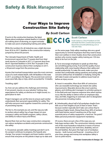 Safety & Risk Management Four Ways to Improve Construction Site Safety By Scott Carlson If you’re in the construction business, the latest figures about workplace-related deaths in Colorado are nothing short of alarming, an urgent reminder to make sure you’re emphasizing training and safety. While the numbers for all industries saw a slight decrease from 2016 to 2017, fatalities in the construction industry jumped by almost 60 percent. The Colorado Department of Public Health and Environment reported that 77 people died from fatal work injuries in Colorado in 2017, a 5 percent drop from the 81 reported fatalities in 2016. But 19 people in the construction business died at their workplace in 2017, a 58 percent surge from the previous year. Injuries that involved transportation were the most common cause of a work-related death, with 38 fatalities in the state in 2017, according to the figures. The second most common cause were falls, slips or trips, which accounted for 14 deaths. Troubling, right? So, how can you address the challenge and minimize, if not prevent, injuries on your jobsites? Setting clear expectations for safety, as obvious as it might sound, is a good place to start. Project managers can set the tone to ensure each worker understands their personal responsibility for safety. This will help everyone work together toward the common goal of preventing injuries. The fact is, the example you set, and the way you talk to workers about safety, has a huge impact on your company’s safety and health program, safety culture, and ability to reduce injury and illness. Beyond that, here are four ways construction companies can reduce workplace accidents and promote construction site safety: 1. Occasional, sporadic safety meetings just don’t cut it. As a project continues to progress, the hazards also change. Your project managers and team leaders need to ensure that everyone on the jobsite is kept up-to-date and Scott Carlson Scott Carlson is a Vice President at CCIG and leads the firm’s construction practice. Reach him at ScottC@thinkccig.com or 720-330-7925. on the same page. Daily safety meetings also are a good opportunity to remind employees that they need to keep their own welfare in mind. Studies show that construction workers who receive regular safety training are 12% less likely to be hurt on the job. 2. Try to encourage employees to speak up when they see something going wrong. Trust and the quality of your relationship with crews heavily influence their safety and overall productivity. To make this work, make sure your workers feel comfortable asking questions and raising safety concerns without fear of retaliation or bullying. Doing this will make it easier and quicker to address issues head-on before an injury occurs. 3. Invest in wearables. More than 80% of contractors who use wearable technology see instant site-safety improvements. Wearable devices like smart watches, glasses, and clothing alert managers to activities going on in the field and even improve response time when injuries occur, like the ability to detect when an employee slips, trips, and falls, triggering an automatic alert to designated site personnel, including medics. 4. Unbelievably, about half of all workplace deaths from falls occur from heights of just 25 feet or lower. That’s because workers typically don’t take care unless they’re working at higher levels. Along those lines, 84% of workers with head injuries weren’t wearing one of the most essential pieces of safety equipment: a hard hat. The point? Make personal protection equipment mandatory. Of course, these are just a few of the ways you can help keep workers safer. The construction industry remains one of the most hazardous industries in terms of serious work-related injuries, lost work time, disability, and on- the-job fatalities. But given the high cost of workplace injuries – both human and financial – investing a bit of your time, energy and money into workplace safety is sure to yield returns. Colorado Construction & Design | 53
