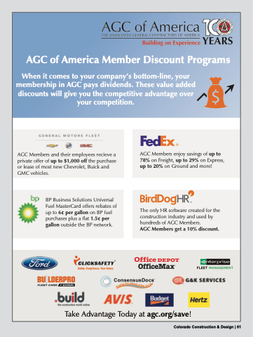 AGC of America Member Discount Programs When it comes to your company’s bottom-line, your membership in AGC pays dividends. These value added discounts will give you the competitive advantage over your competition. AGC Members and their employees recieve a private offer of up to $1,000 off the purchase or lease of most new Chevrolet, Buick and GMC vehicles. BP Business Solutions Universal Fuel MasterCard offers rebates of up to 6¢ per gallon on BP fuel purchases plus a flat 1.5¢ per gallon outside the BP network. AGC Members enjoy savings of up to 78% on Freight, up to 29% on Express, up to 20% on Ground and more! TM The only HR software created for the construction industry and used by hundreds of AGC Members. AGC Members get a 10% discount. CLICKSAFETY ® Safety. Compliance. Your Future. ConsensusDocs® Take Advantage Today at agc.org/save! Colorado Construction & Design | 61 u o Y g n e i v p r u e C e A h e a K d o f t h e
