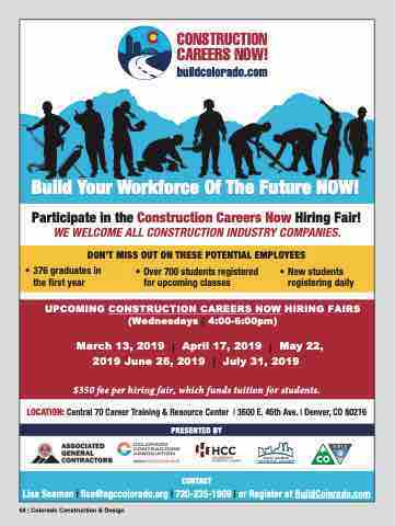 CONSTRUCTION CAREERS NOW! buildcolorado.com Build Your Workforce Of The Future NOW! Participate in the Construction Careers Now Hiring Fair! WE WELCOME ALL CONSTRUCTION INDUSTRY COMPANIES. DON’T MISS OUT ON THESE POTENTIAL EMPLOYEES • 376 graduates in • Over 700 students registered • New students the first year for upcoming classes registering daily UPCOMING CONSTRUCTION CAREERS NOW HIRING FAIRS (Wednesdays | 4:00-6:00pm) March 13, 2019 | April 17, 2019 | May 22, 2019 June 26, 2019 | July 31, 2019 $350 fee per hiring fair, which funds tuition for students. LOCATION: Central 70 Career Training & Resource Center | 3600 E. 46th Ave. | Denver, CO 80216 PRESENTED BY Em ily G riffith CONTACT Lisa Seaman | lisa@agccolorado.org | 720-235-1909 | or Register at BuildColorado.com 64 | Colorado Construction & Design