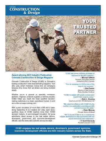 YOUR TRUSTED PARTNER Award-winning AEC Industry Publication: Colorado Construction & Design Magazine Colorado Construction & Design (CC&D) is Colorado’s leading construction news and marketing magazine. Year after year, smart marketers renew their ad campaigns because they know their ad dollars are being invested wisely. Whether you’re a general or specialty contractor, architect, engineer, products supplier or service provider, CC&D helps you reach the most qualified decision- making customers in a clean, uncluttered format, in print and online at www.ccdmag.com. With a print circulation of more than 4,500 and a pass- along readership of 2.3 readers per copy, each twice- quarterly issue of CC&D reaches more than 10,000 decision makers. A well-managed circulation list gives advertisers direct access to top real estate owners, developers, government and economic-development officials, and the entire AEC industry across the state. “CC&D has driven millions of dollars of business to the AEC industry.” —Michael Gifford President, Associated General Contractors (AGC) Colorado “Our ad campaign in CCD is one of the keys to our success.” —Dan Parker Director of Client Services Rocky Mountain Prestress “CC&D is loaded with great content and I read it from cover to cover.” —Rick L. Kinning Chairman and CEO, RK Mechanical, Inc. “We value our alliance with CC&D. It’s the number one publication providing us with outreach across the state.” —Peter Monroe Principal, Monroe & Newell “We’ve found CC&D to be a consistently reliable destination to stay connected with our clients and reach new customers.” —T. Scott Kennedy President and COO, CCIG CC&D engages top real estate owners, developers, government agencies, economic development officials and AEC industry leaders across the State. Colorado Construction & Design | 65 CCD_05_2016-v03:CCD 7/5/16 7: “IN E