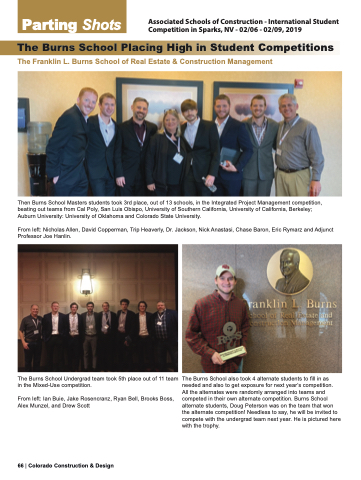 Parting Shots The Burns School Placing High in Student Competitions Associated Schools of Construction - International Student Competition in Sparks, NV - 02/06 - 02/09, 2019 The Franklin L. Burns School of Real Estate & Construction Management Then Burns School Masters students took 3rd place, out of 13 schools, in the Integrated Project Management competition, beating out teams from Cal Poly, San Luis Obispo, University of Southern California, University of California, Berkeley; Auburn University: University of Oklahoma and Colorado State University. From left: Nicholas Allen, David Copperman, Trip Heaverly, Dr. Jackson, Nick Anastasi, Chase Baron, Eric Rymarz and Adjunct Professor Joe Hanlin. The Burns School Undergrad team took 5th place out of 11 team in the Mixed-Use competition. From left: Ian Buie, Jake Rosencranz, Ryan Bell, Brooks Boss, Alex Munzel, and Drew Scott The Burns School also took 4 alternate students to fill in as needed and also to get exposure for next year’s competition. All the alternates were randomly arranged into teams and competed in their own alternate competition. Burns School alternate students, Doug Peterson was on the team that won the alternate competition! Needless to say, he will be invited to compete with the undergrad team next year. He is pictured here with the trophy. 66 | Colorado Construction & Design