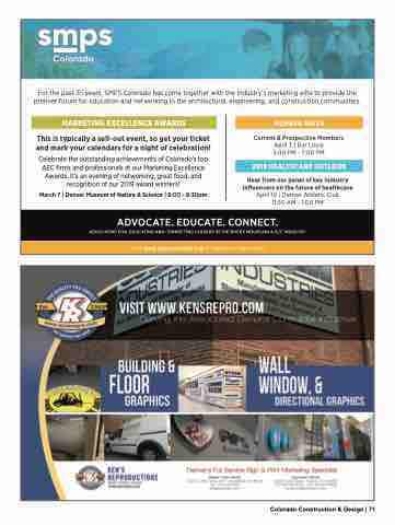 For the past 35 years, SMPS Colorado has come together with the industry’s marketing elite to provide the premier forum for education and networking in the architectural, engineering, and construction communities. MARKETING EXCELLENCE AWARDS This is typically a sell-out event, so get your ticket and mark your calendars for a night of celebration! Celebrate the outstanding achievements of Colorado’s top AEC firms and professionals at our Marketing Excellence Awards. It’s an evening of networking, great food, and recognition of our 2019 award winners! March 7 | Denver Museum of Nature & Science | 6:00 - 9:30pm MEMBER MIXER Current & Prospective Members April 3 | Bar Louie 5:00 PM - 7:00 PM 2019 HEALTHCARE OUTLOOK Hear from our panel of key industry influencers on the future of healthcare April 10 | Denver Athletic Club 11:30 AM - 1:00 PM Colorado Construction & Design | 71